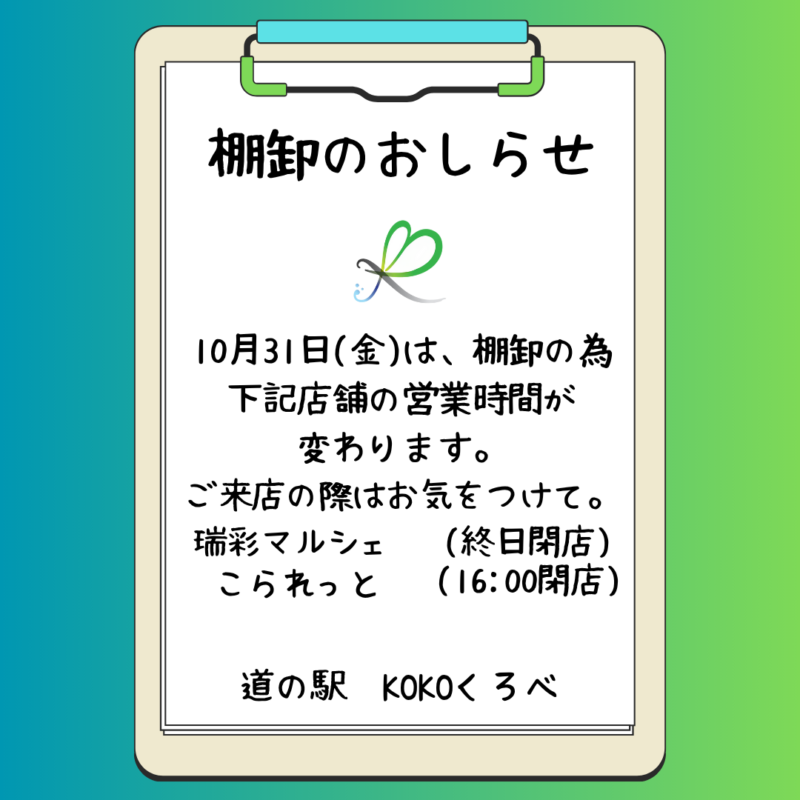 お知らせ 2025/10/28 棚卸のおしらせ いつも道の駅KOKOくろべをご利用いただきありがとうございます。10月31日(金)は棚卸のため、下記店舗営業時間が変更となります。ご来館・お買物の際にはお気をつけください。