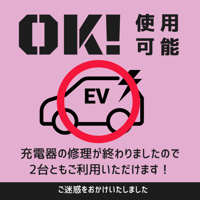 先日より故障していたEV充電器の修理が完了し、本日よりご利用いただけるようになりました。