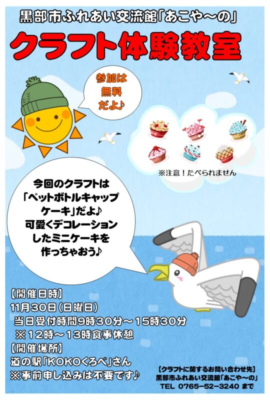 黒部市ふれあい交流館「あこやーの」によるクラフト体験教室を開催します。